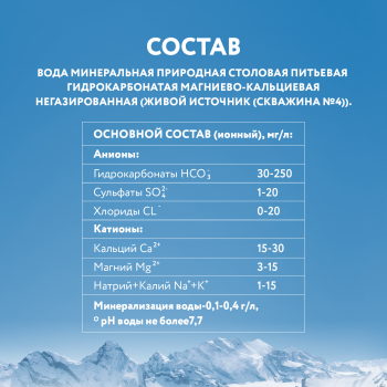Вода минеральная природная столовая питьевая " Скалла"("Skalla")", гидрокарбонатная магниево-кальциевого состава негазированная, "Живой источник" скважина №4 Верхнедаусузского участка Зеленчукского района Карачаево-Черкесской республики